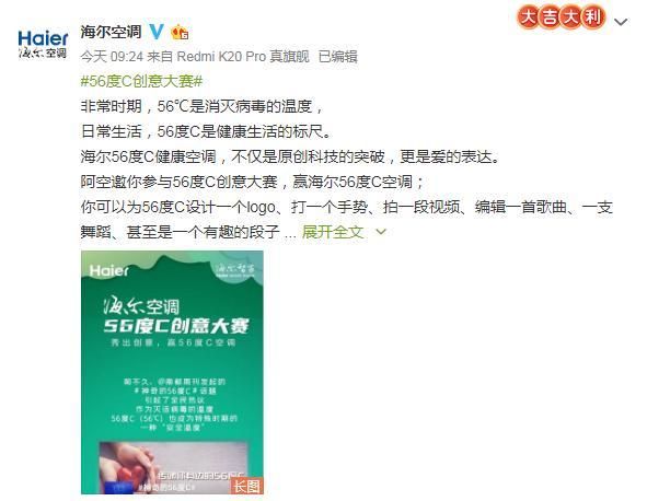 2月底,微博话题#神奇的56度C#引发超2200万网友关注,海尔空调官方回复说,海尔空调也有56度C。3月3日,海尔空调在官方微博、官方抖音号上线“56度C创意大赛”,邀请网友为自清洁空调56度C高温除菌功能定制专属的创意表达方式。