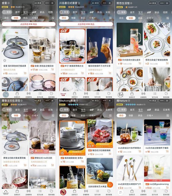 在淘宝搜索“玻璃杯”的结果中,我们随机挑选了六家“极有家店铺”,这六家店的粉丝从十几万到两百多万不等,属于家居生活用品店铺中具有一定规模的佼佼者,但很容易发现,它们从产品设计到图片风格都存在大量雷同,就连产品定价也相去不远。在从产品到宣传全方位同质化的情况下,所积累的十几万甚至几百万粉丝不可能存在太大的品牌忠诚度,复购的产生或许是由于消费惯性,或许只是由于一两块钱差价,等到消费者找到更低的价格就会很快转向其他店铺。