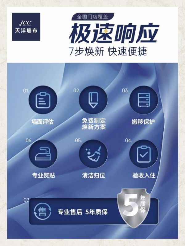 ③ 7步标准化服务流程方便快捷(墙面评估-免费制定焕新方案-搬移保护-专业熨贴-验收入住-5年质保)