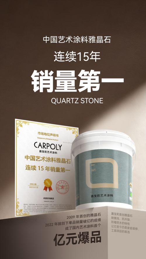 2025年9月,涂料行业迎来里程碑时刻——嘉宝莉凭借雅晶石系列,斩获“中国艺术涂料雅晶石连续15年销量第一”的殊荣。这场由尚普咨询集团权威认证的盛典,不仅印证了雅晶石的市场统治力,更揭开了嘉宝莉从“单品爆款”到“品类传奇”的进化密码。而今,雅晶石家族再添新成员——「柔砂」,以创新姿态续写传奇,开启艺术涂料新纪元。