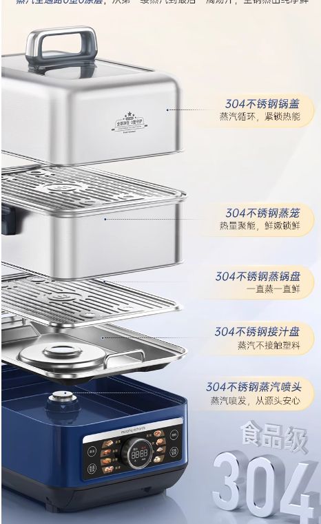给孩子蒸蛋羹、给老人炖补品,最怕的就是高温下塑料析出的隐形风险。市面上多数蒸锅的蒸汽口、接汁盘暗藏塑料部件,长期使用隐患难防。摩飞全钢速蒸锅“0塑0涂层”, 从锅盖、蒸笼到喷头、接汁盘,全线采用食品级304不锈钢打造;蒸汽通道全程无塑料接触,用真材实料守护全家饮食安全底线。