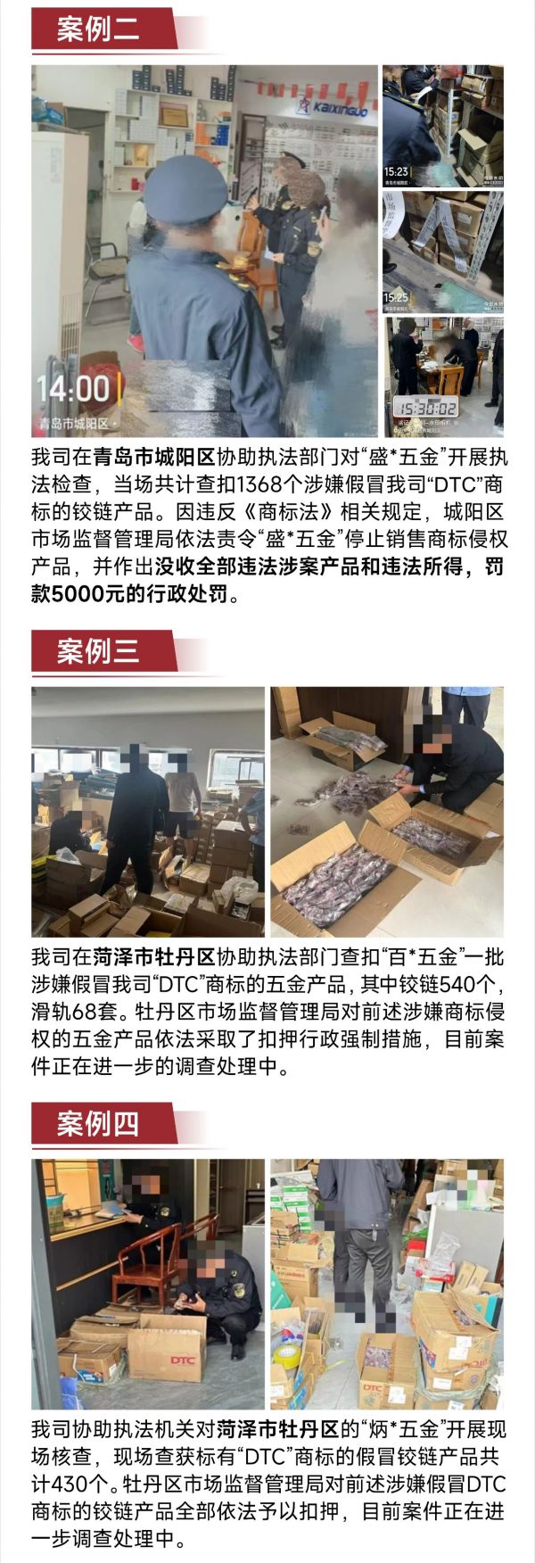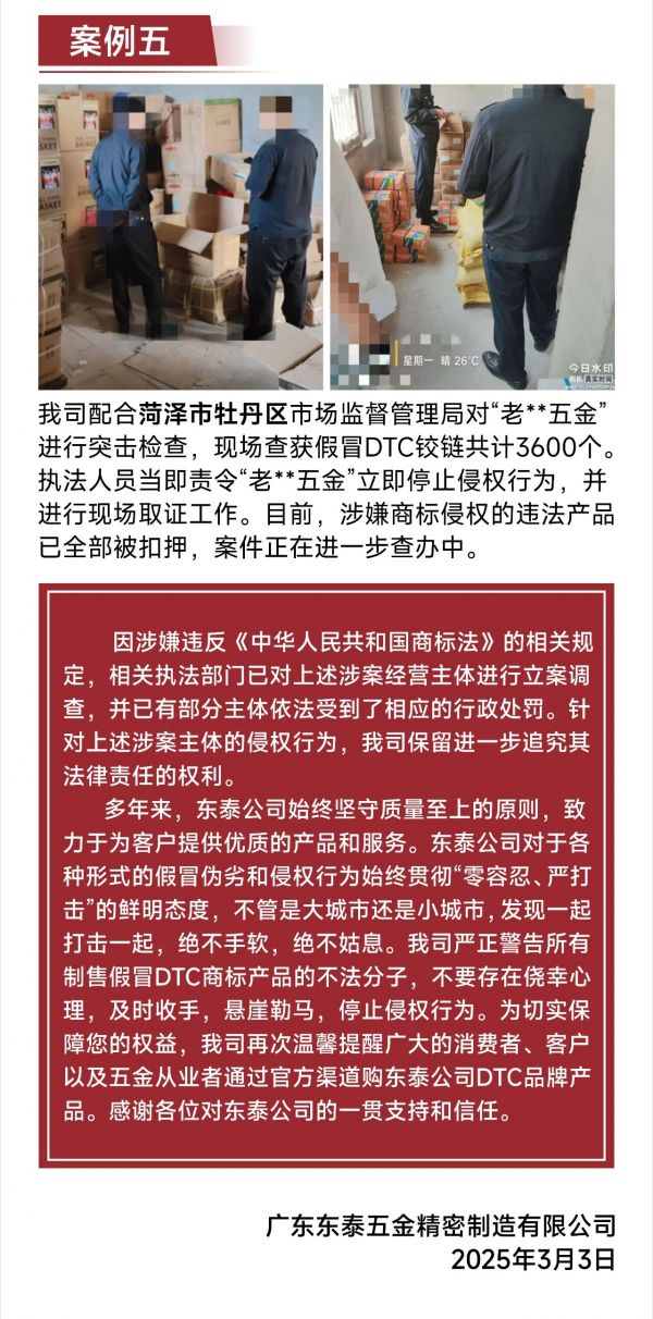 东泰五金发文维权:零容忍制售假冒“DTC”五金产品违法行为