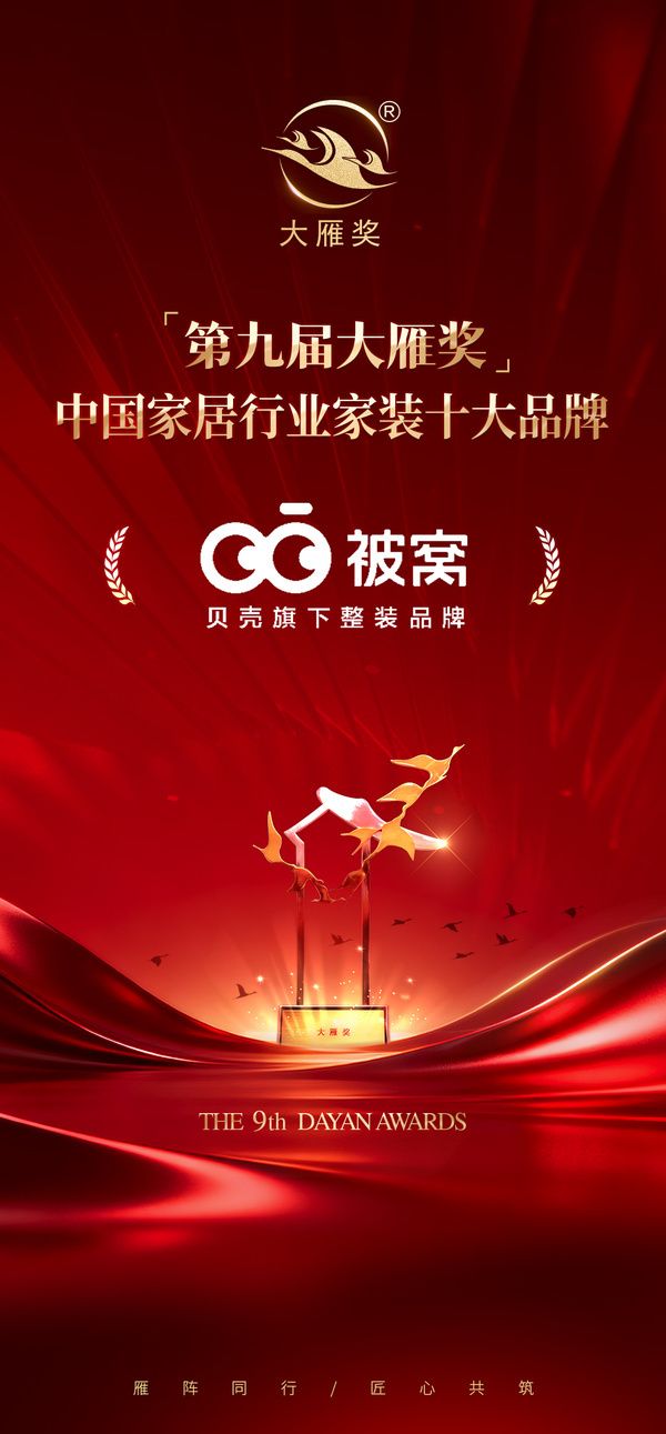 1月30日,「第九届大雁奖」获奖名单于云端发布会正式揭晓。被窝整装凭借其在中国家装行业领域的卓越产品力、领先的品牌影响力与持续的市场引领表现,荣获“第九届大雁奖·中国家居行业家装十大品牌”这一细分领域的权威殊荣。