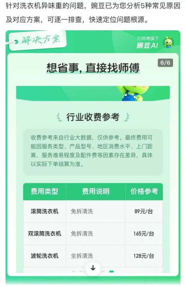 作为家居服务场景的专业AI,豌豆AI智能助手内置于万师傅微信小程序,无论是家具安装的步骤疑问、家电故障的初步诊断,还是家居保养的专业建议,只需打开万师傅小程序,向豌豆描述遇到的具体问题,即可获得专业故障诊断、详细图文教程、行业参考均价及优质师傅履历。